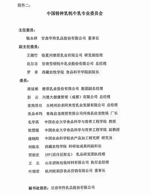 2021年12月1日,中国乳制品工业协会宣布成立中国特种乳牦牛乳专业委员会,甘肃华羚乳品股份有限公司董事长敏永祥担任首届中国特种乳牦牛乳专业委员会主任委员,并将中国特种乳牦牛乳专业委员会秘书处设在甘肃华羚乳品股份有限公司。