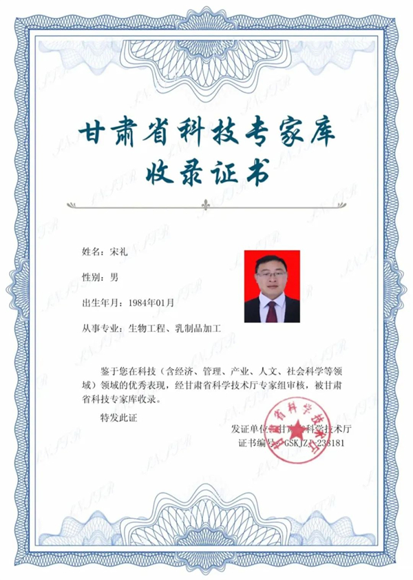 甘肃华羚乳品股份有限公司技术中心正高级工程师、经理、甘南牦牛乳研究院专家宋礼同志经甘肃省科学技术厅专家组审核,被甘肃省科技专家库收录。